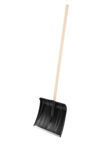 Пластиковая лопата 61697 размером 380 х 350 х 1370 мм, с деревянным черенком, используется для уборки снега.