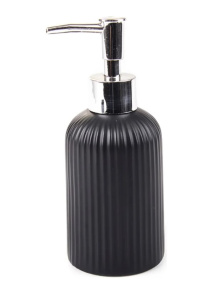 Дозатор для жидкого мыла Плиссе черный цилиндрической формы с ребристой поверхностью, предназначен для порционной подачи мыла, шампуней и других гелеобразных жидкостей. Подача моющего средства осуществляется с помощью пластиковой хромированной помпы. Влагоустойчив.