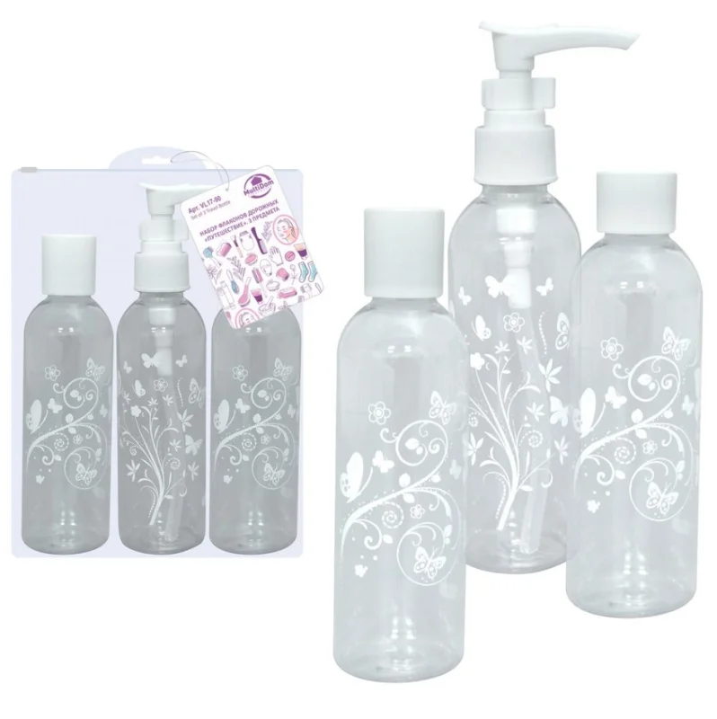 В набор входят три флакона, один из которых с удобным дозатором. Благодаря прозрачной косметичке с замком зип-лок, её содержимое всегда на виду и на своём месте. Изготовлено: флаконы из пластмассы (полипропилен), косметичка из полимерного материала (полиэтилентерфталат).