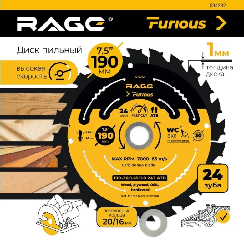 Диск предназначен для быстрого и точного распила твердой, мягкой древесины, фанеры, ламината, МДФ. Твердосплавные прочные зубья и конструкция диска обеспечивают хорошее качество поперечного и продольного пропила. Прорези на диске способствуют предотвращению перегрева и деформации диска, а также снижают шум и биение, вызываемые вибрацией пилы. Защитное покрытие диска уменьшает трение, что также снижает перегрев, уменьшает количество налипающей пыли и защищает от коррозии. Диск подходит для ручных дисковых пил без расклинивающего ножа. Допускается эксплуатация диска с потерей зубьев до 20% (не подряд).
