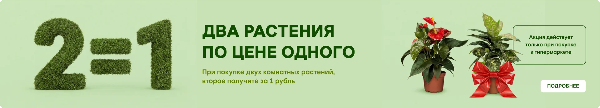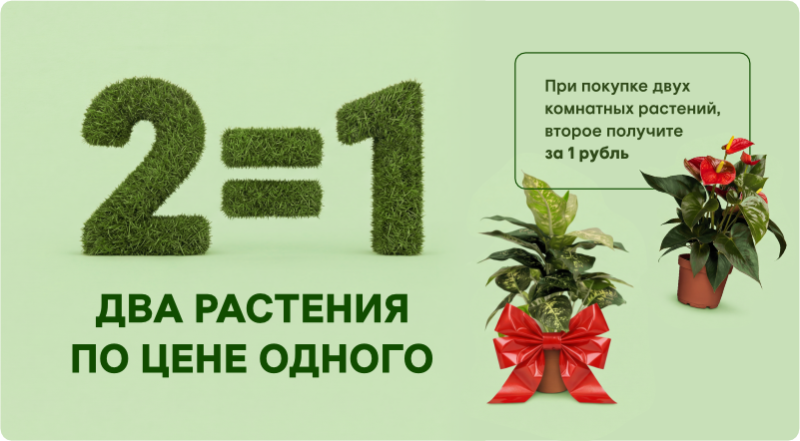 При покупке двух комнатных растений, второе получите за 1 рубль.