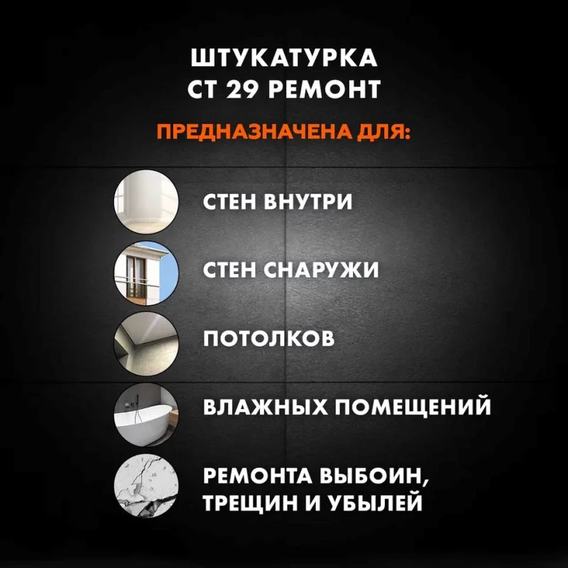 Штукатурка и ремонтная шпаклевка CT 29 предназначена для ремонта, выравнивания и оштукатуривания цементноизвестковых, цементно-песчаных, бетонных и кирпичных оснований на стенах и потолках внутри и снаружи зданий, как при ручном, так и механизированном нанесении.