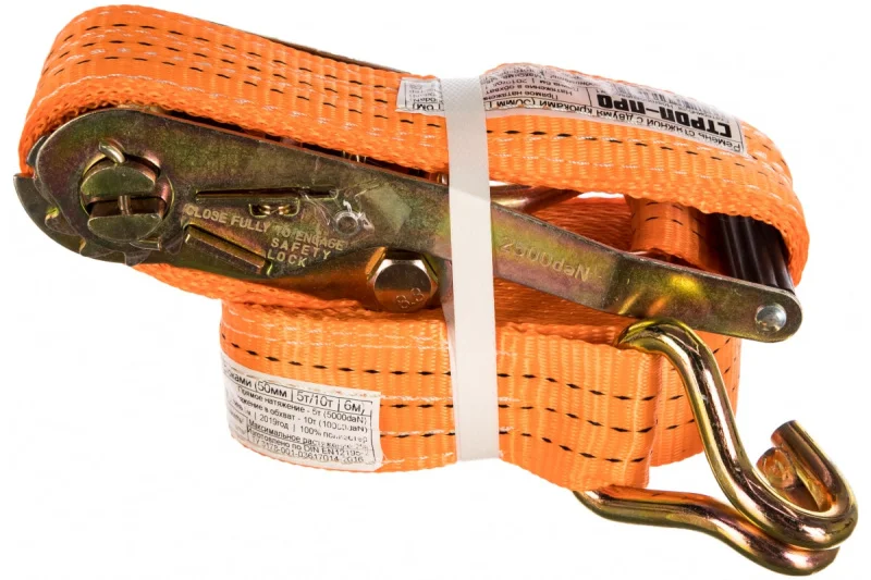 Стяжной ремень с крюками (50мм, 5т, 6м оранжевый) СТРОП-ПРО SP03008 предназначен для быстрого и надежного крепления грузов. Эти изделия применяются при перевозках на грузовых автомобилях, прицепах, эвакуаторах и другом транспорте. Стяжной ремень состоит их полиэстровой ленты, мощного храповика и двух крюков на концах.