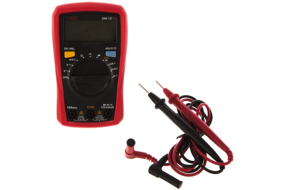 Цифровой мультиметр RGK DM-12 776561 пригодится при диагностике электроприборов на предмет неисправности. С его помощью можно измерить силу тока, напряжение, сопротивление и емкость.