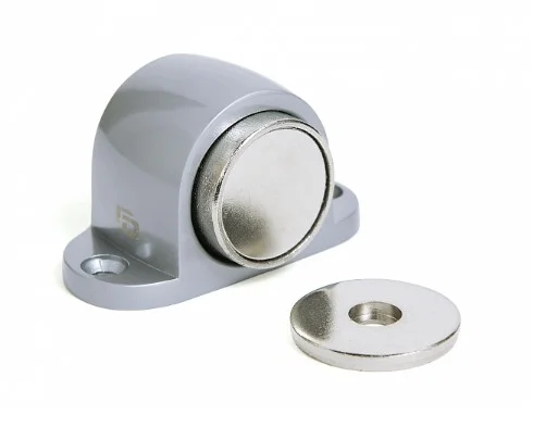 Магнитный дверной ограничитель: металлический диск крепится к полотну, стопор с магнитом – на пол. Если дверь без перекосов и не слишком тяжелая, то ограничитель будет работать еще и как фиксатор, удерживая дверь открытой.