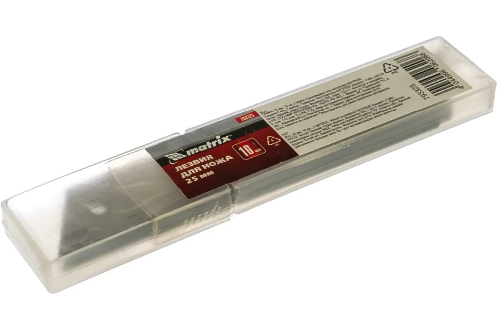 Лезвие MATRIX 793325 - сменное приспособление для ножа. Оно состоит из нескольких сегментов, каждый из которых имеет свою режущую кромку. Если лезвие затупилось, то, обломив один сегмент, можно продолжить работу новой режущей кромкой. Выполнено из стали твердостью 65 HRс. Отлично подходит для резки картона, бумаги и других подобных материалов.
