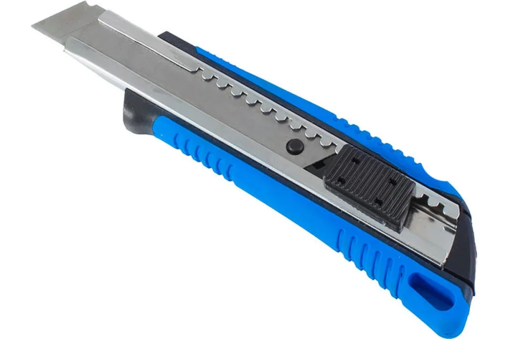 Усиленный нож РемоКолор с автоматическом фиксатором, сегментированное лезвие, 18х100мм, 19-0-009 предназначен для разрезания бумаги, картона, мягкого пластика, упаковочного скотча. Сегментированное лезвие из прочной инструментальной стали устойчиво к коррозии. Нож оснащен прямым выдвижным лезвием, сегменты которого легко отламываются плоскогубцами или специальным приспособлением по мере необходимости.