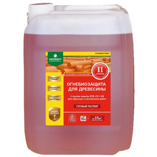 PROSEPT PROF является огнезащитной обработкой для деревянных конструкций, обеспечивающая их защиту от возгорания, гниения и биологических агентов. Подходит как для новых, так и обработанных огнезащитой деревянных конструкций. Устойчив к старению, не вызывает выщелачивания и высаливания.