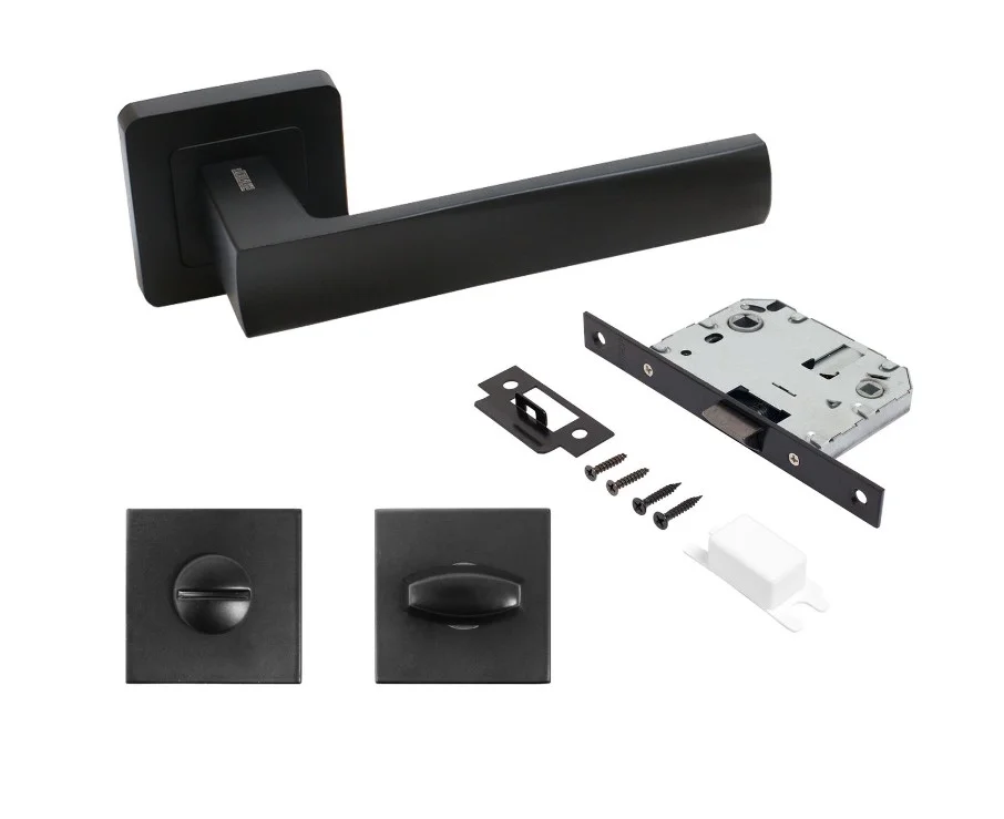 Комплект: ручка на квадратной накладке, сантехническая завертка и защелка с фиксацией .Материал ручек и завертки — алюминиевый сплав, защелки - сталь. Покрытие - полимерная краска. Комплектуются винтовыми стяжками и шурупами. Длина разрезного квадрата - 95мм. Для деревянных дверей, толщиной 35-40 мм.