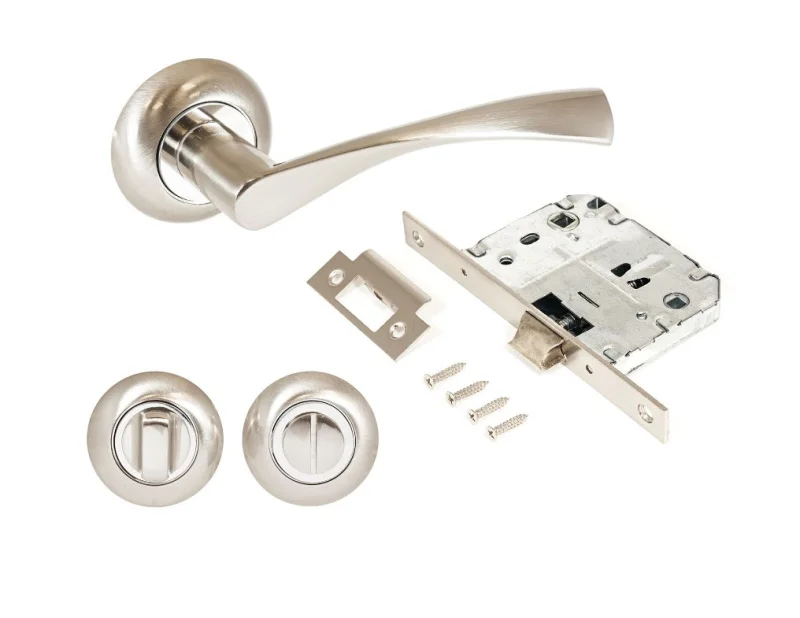 Комплект: ручка на квадратной накладке, сантехническая завертка и защелка с фиксацией .Материал ручек и завертки — алюминиевый сплав, защелки - сталь. Покрытие - полимерная краска. Комплектуются винтовыми стяжками и шурупами. Длина разрезного квадрата - 95мм. Для деревянных дверей, толщиной 35-40 мм.