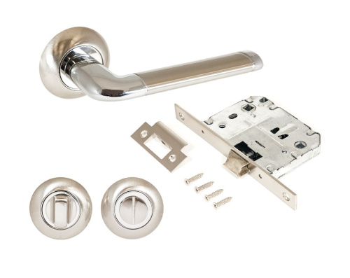 Комплект: ручка на квадратной накладке, сантехническая завертка и защелка с фиксацией .Материал ручек и завертки — алюминиевый сплав, защелки - сталь. Покрытие - полимерная краска. Комплектуются винтовыми стяжками и шурупами. Длина разрезного квадрата - 95мм. Для деревянных дверей, толщиной 35-40 мм.