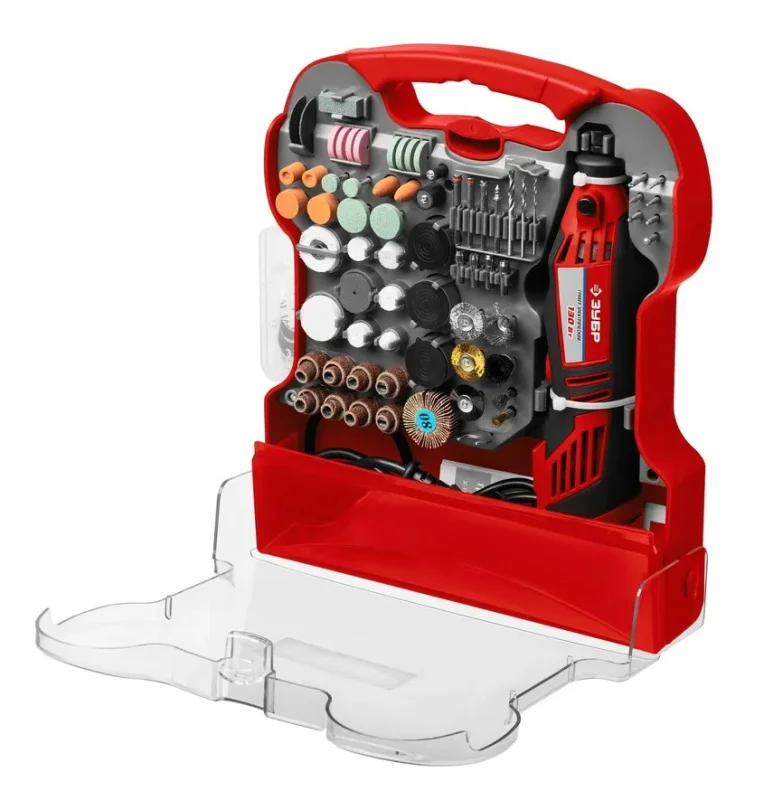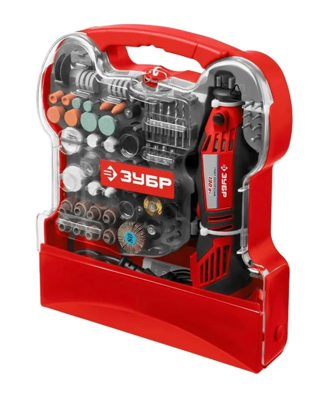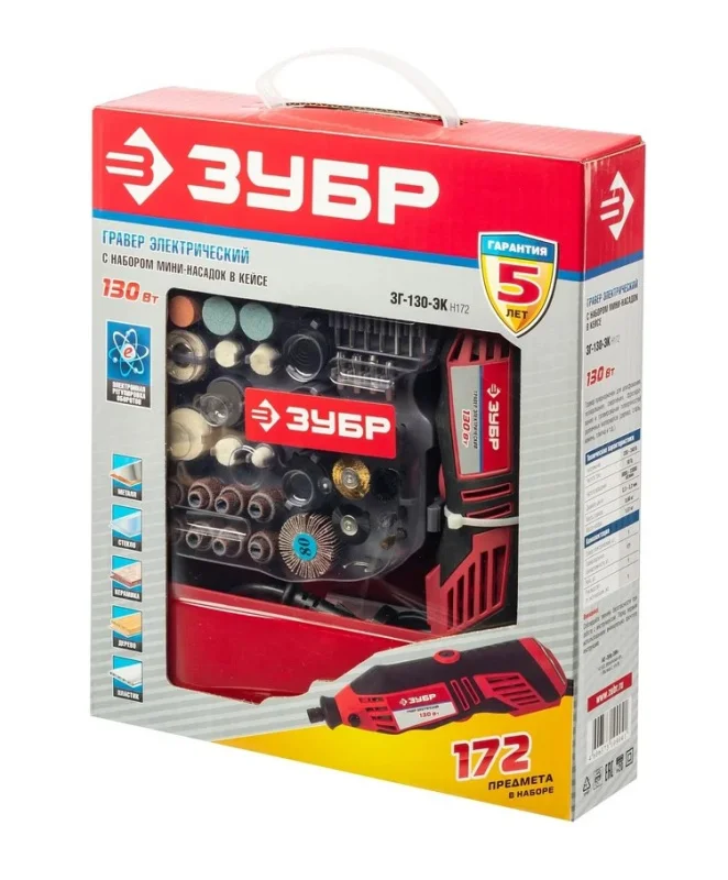Электрический гравер ЗУБР с набором мини-насадок, 172 предмета ЗГ-130ЭК H172 предназначен для выполнения широкого спектра задач: резки, шлифования, полировки, гравирования - все зависит от установленной оснастки.
