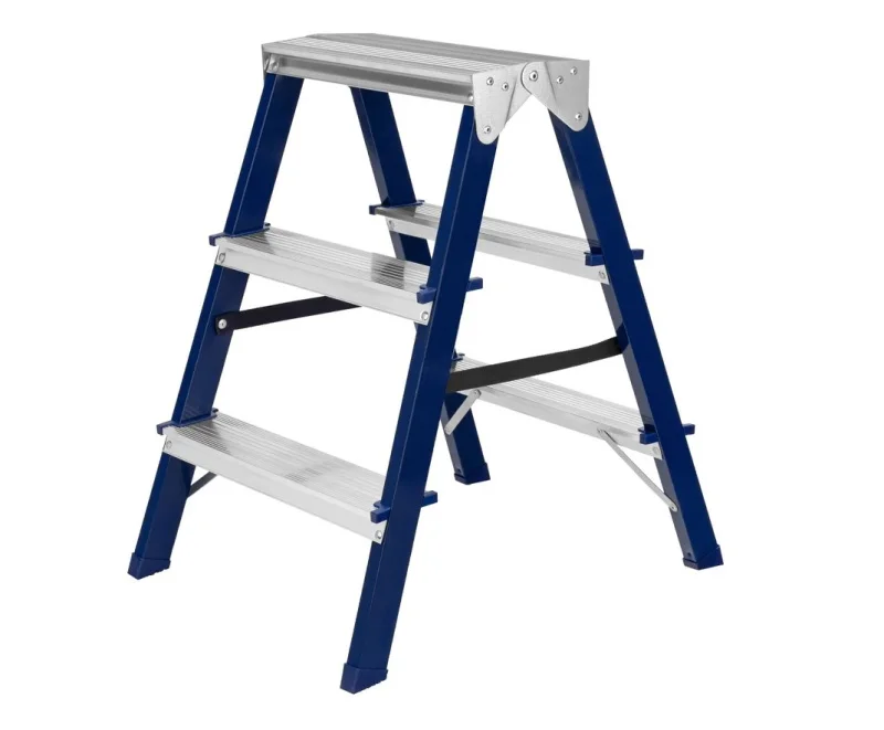 Легкие и прочные двусторонние стремянки выдерживают увеличенный вес до 150 кг, имеют рифленые ступени и удобную широкую площадку. Благодаря пластиковым заглушкам не скользят и не повреждают напольное покрытие. Идеальны для работы одного или двух человек одновременно.