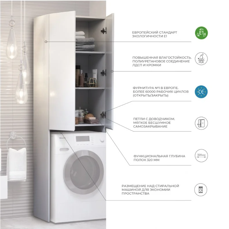• Компактность и эргономичность: идеально разработанная конструкция позволяет максимально эффективно использовать пространство над стиральной машиной, создавая дополнительное место для хранения.