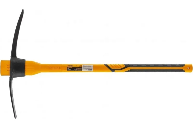 Кирка Denzel 2250 г, широкая, фиберглассовая обрезиненная рукоятка, 900 мм 21838 представляет собой ручной ударный инструмент, предназначенный для работы по камню, каменистому грунту, очень плотному грунту, для разрушения старой кладки, льда, бетона и т.д. Рабочая часть изготовлена из стали 65Г методом ковки, режущие кромки закалены на твердость 45HRC и заточены. Внутри пластиковой рукоятки расположен фибергласовый стержень, значительно увеличивающий ее прочность. Места хвата обрезинены и имеют ярко выраженный противоскользящий рельеф.