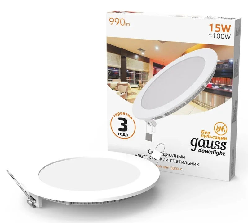 Gauss Встраиваемый светильник ультратонкий круглый 939111115 предназначен для установки в подвесные потолки. Обеспечивает высокую эффективность освещения внутреннего пространства помещения. Светодиодный источник освещения отличается мгновенным включением и отключением, а также продолжительным сроком службы и сниженным уровнем энергопотребления.