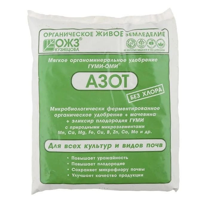 Порошково–гранулированное удобрение с необходимыми для питания растений макро- и микроэлементами и эликсиром плодородия Гуми, с высоким содержанием азота.