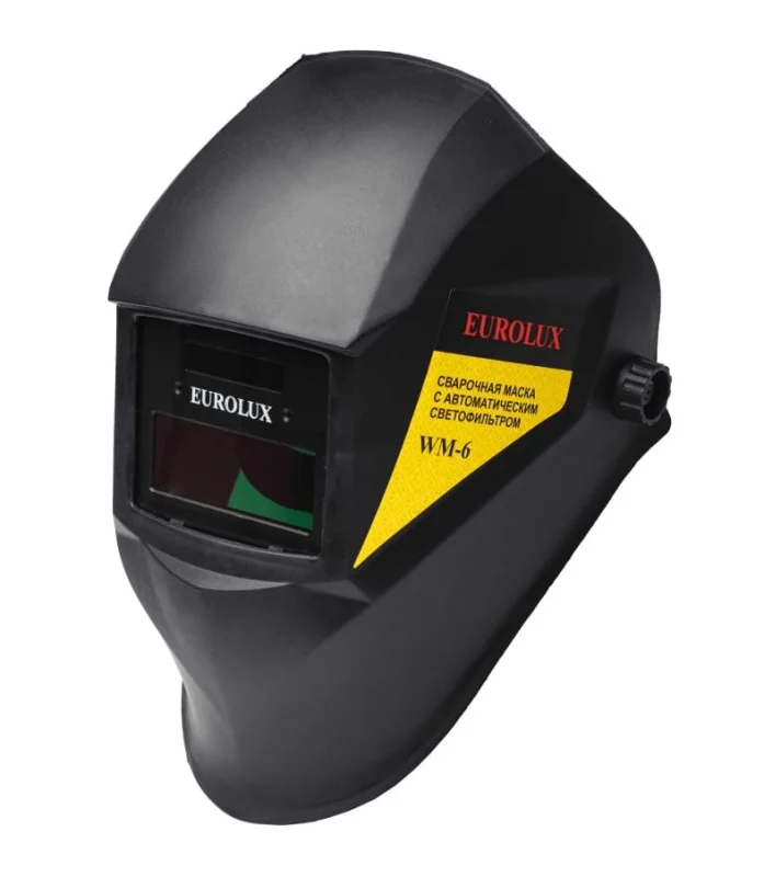 Сварочная маска Eurolux WM-6 используется для защиты глаз от световых бликов, искр и окалин. Смотровое окно размером 90х35 мм оснащено светофильтром типа «хамелеон», представляющим собой однослойный жидкокристаллический экран. Благодаря наличию 2 датчиков он мгновенно затемняется в момент зажигания дуги. Автоматический светофильтр самостоятельно меняет степень затемнения в зависимости от интенсивности светового потока. В светлом состоянии она равна 4 DIN, в темном - 11 DIN. Время переключения при температуре +20° С составляет 1,2 мс.