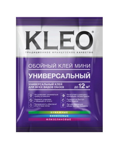 Обойный клей KLEO MINI разработан для приклеивания флизелиновых, виниловых и бумажных обоев всех типов. Этот сухой клей предлагается в экономичной упаковке, которой достаточно для обработки поверхности до 12м². Небольшая фасовка станет оптимальным выбором, если требуется оклеить небольшой участок стены или когда основного объема клея не хватает.