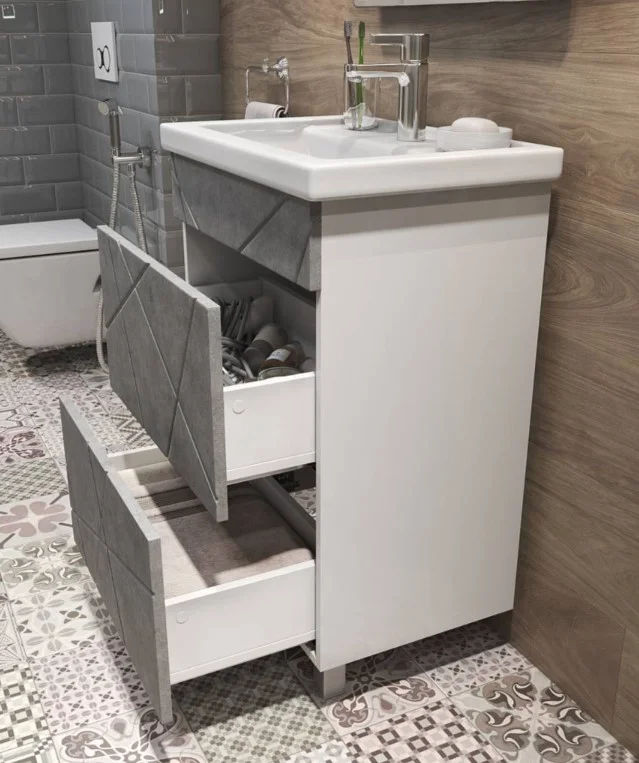 • Современный дизайн: Тумба выполнена в стильном бетонном оформлении, что привносит в интерьер нотки минимализма и индустриального шика. Такой дизайн будет гармонично смотреться в ванной комнате любого стиля