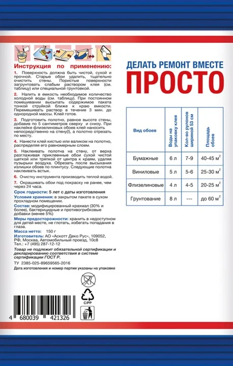 Просто-клей – это универсальный обойный клей в концентрированном виде. Его основа – это крахмал с улучшенными характеристиками, обеспечивающий прочное приклеивание обоев к стене. В состав включены компоненты, предотвращающие рост плесени и грибков.