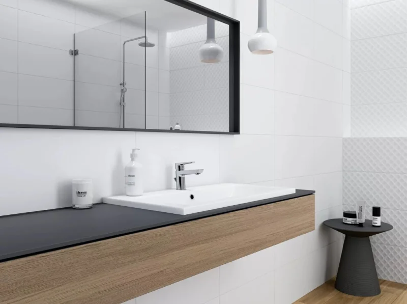 Белый цвет в классическом стиле оживает в коллекции DECO благодаря использованию рельефа «ромбы». Этот дизайнерский приём открывает возможности для игры с поверхностями и различной компоновки плитки. В интерьере изысканность и мягкий блеск создаёт тонкий бордюр с золотистым металлическим оттенком. Он может быть использован для зонирования пространства или как самостоятельный декоративный элемент, размещённый между рядами плитки.