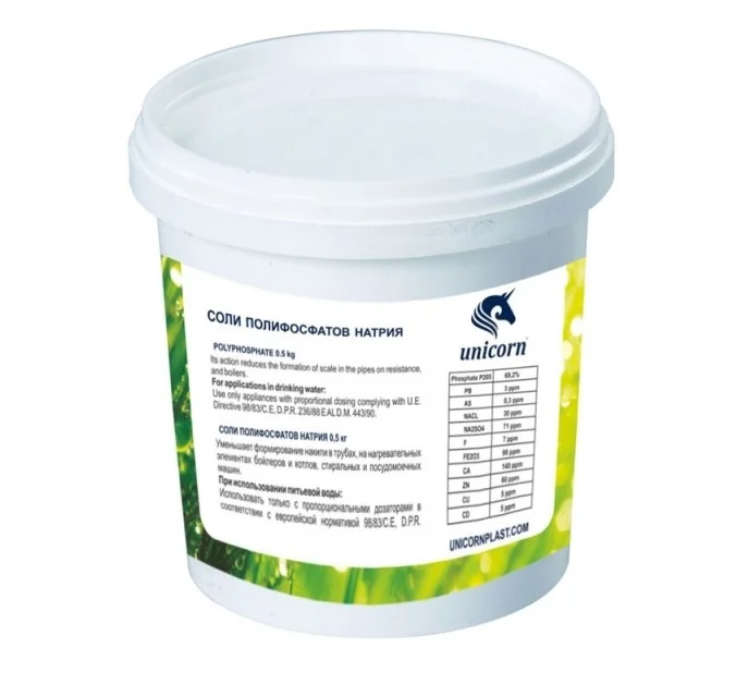 • Эффективная защита от накипи: полифосфатная соль предотвращает образование накипи на нагревательных элементах бытовых приборов, таких как стиральные и посудомоечные машины, бойлеры и чайники.