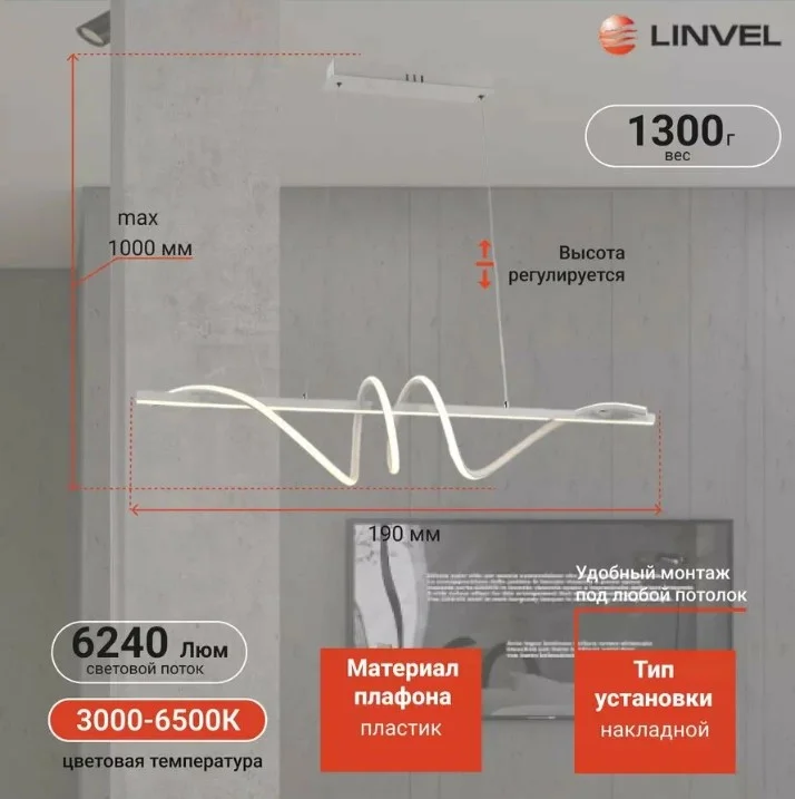 Светильник потолочный Linvel MS 1175 Авила имеет размеры 1000х190х1000 мм, что позволяет его легко установить в различных помещениях. Вес светильника составляет всего 1,3 кг, что делает его легким и удобным в установке.