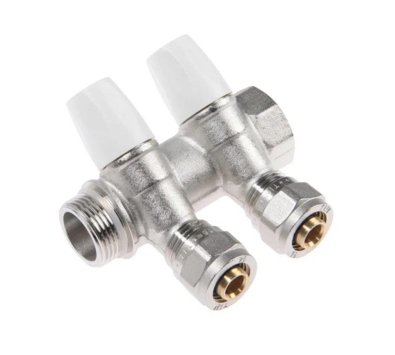 Распределительный коллектор с угловым вентилем под 45 градусов 3/4" совместим с трубами Ф16 мм и имеет 2 выхода. Модель TIM MR135N-3/4-C-2.