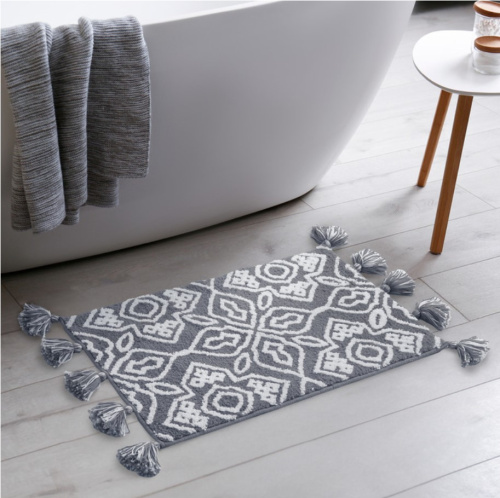 Мягкий серый коврик для ванной с декоративными пушистыми кисточками и белым узором, очень приятный на ощупь. Ворс из микрофибры отлично держит форму, легко чистится и быстро сохнет. Коврик подойдет для ванной и туалета, а также поможет создать уют в спальне или гостиной.