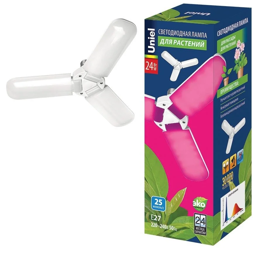Трёхлепестковая светодиодная фитолампа LED-P65-24W/SPSB/E27/FR/P3 PLP32WH ТМ Uniel со специальным красно-синим спектром пользуется высоким спросом у покупателей в зимний и весенний периоды. Лепестки лампы фиксируются в трех разных положениях: полностью открыты, полностью закрыты и в промежуточном положении. Модель проста и удобна в использовании: угол рассеивания лампы 180º обеспечивает большую площадь освещения. Фотосинтетический фотонный поток - 33 мкмоль/с - значительно ускоряет фотосинтез растений. Лампа питается от сети с напряжением 220В. Имеет степень защиты IP20 и долгий срок службы (30 000 ч
