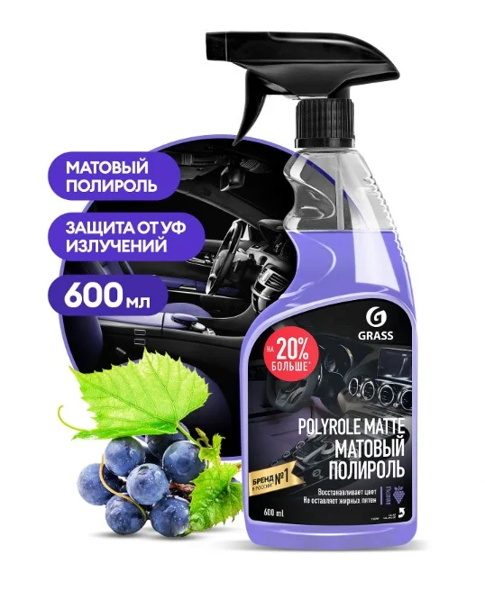 Профессиональный матовый полироль для обработки приборных панелей, очистки и полировки изделий из кожи, дерева, винила, пластика и резины. Сохраняет первоначальный цвет, не оставляет жирных пятен, препятствует оседанию пыли, придает матовый блеск. Средство обладает приятным ароматом.