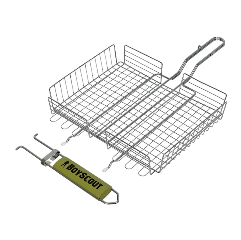 Размер: 62(+5) x 30 x 25 x 5,5 cм. Жарочная поверхность 30*25*5,5 см Решетки для барбекю BoyScout в отличие от шампуров универсальны. Они подходят не только для мяса, рыбы, бифштексов, курицы, но и для сарделек, сосисок, овощей и прочего. Мы предлагаем решетки для барбекю с антипригарным и хромированным покрытием, а также решетки из нержавеющей стали. Решетки имеют деревянные ручки, которые не нагреваются при использовании. Разнообразие размеров и форм позволяет Вам без особых хлопот приготовить вкусную еду в любых количествах.