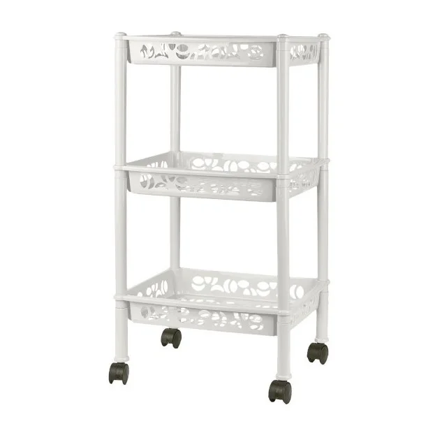 Прямоугольная этажерка - это эффективное и недорогое решение для организации хранения в небольших помещениях, на кухне, в ванной, на балконе или лоджии, в кладовой или на даче. Отличительная особенность этажерки - она невысокая и войдет под любую столешницу. Напольная этажерка состоит из трех полок с небольшими бортиками. Габариты этажерки в собранном виде 370х290х690 мм, она собирается без инструментов за несколько минут, достаточно соединить стойки и полки, вставить ножки и заглушки. На нижних ножках предусмотрены колесики, ее легко выдвигать и устанавливать на место. Универсальная этажерка входит в линию Prima, можно подобрать сразу несколько этажерок из коллекции и установить их рядом.