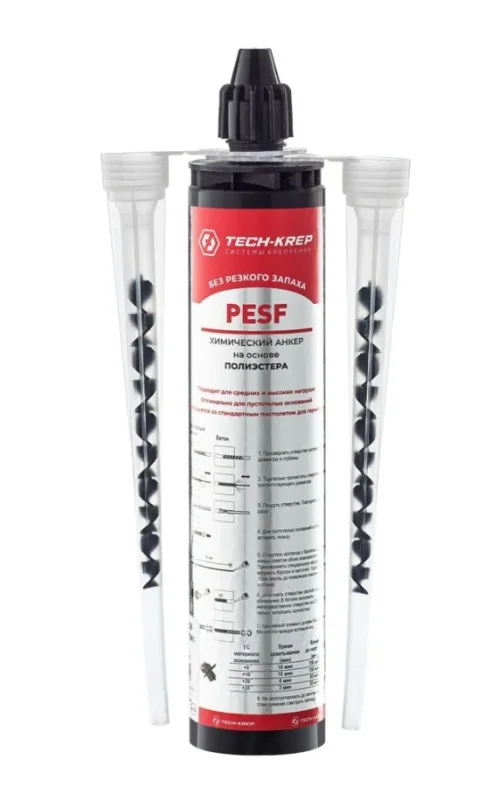Особенности: подходит для средних нагрузок. PESF – это двухкомпонентный химический состав на основе синтетической быстротвердеющей полиэстерной смолы, не содержит стирол и не имеет запаха. Не создает предварительного напряжения в бетоне. Используется совместно с металлическими анкерными элементами (резьбовыми шпильками, болтами, арматурными прутками и т.п.) и сетчатыми гильзами для пустотелых материалов. Подходит для стандартного пистолета под герметик. Картридж, который израсходован не полностью, можно использовать с новым смесителем при условии его хранения с закрытой крышкой.