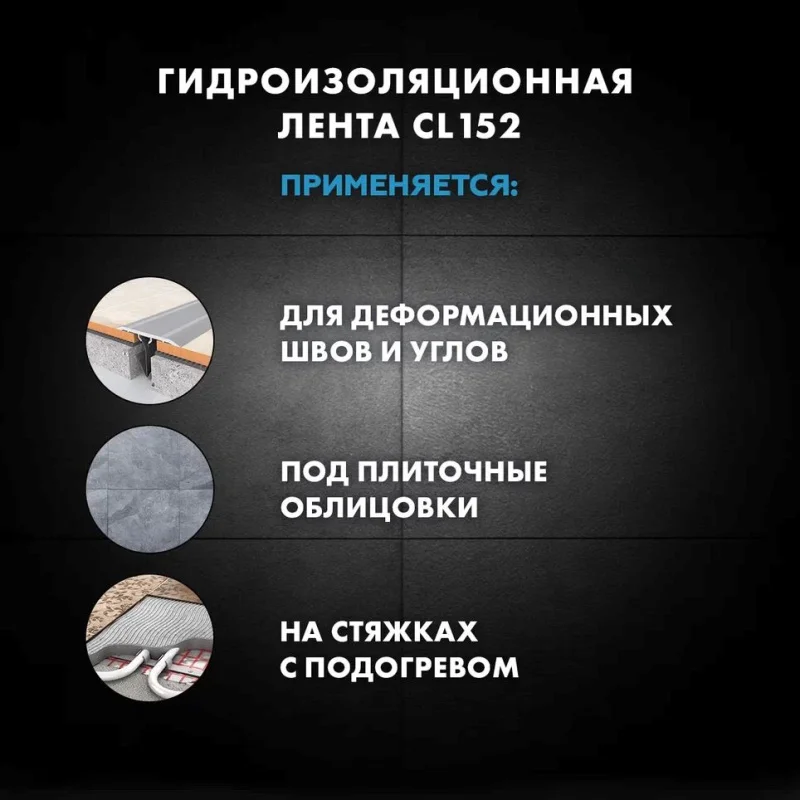 Герметизирующая лента CL 152 представляет собой сетку из полиэстера с водонепроницаемым покрытием из термопластичного эластомера и предназначена для герметизации деформационных швов и угловых зон внутри и снаружи зданий при условии отсутствия негативного (т.е. со стороны основания) давления воды. Применяется при гидроизоляции душевых, санузлов, бассейнов, резервуаров, дренажных каналов, вводов инженерных коммуникаций, террас, балконов и т.д. в сочетании с эластичными обмазочными гидроизоляци- онными материалами, такими как CL 51, CR 166, а также CR 65 с добавкой эластификатора CC 83.