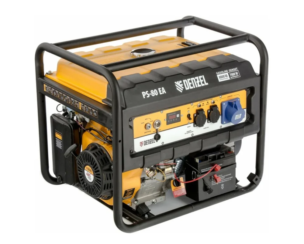 Бензиновый генератор Denzel PS 80 EA обеспечит приборы суммарной мощностью 8 кВт. Подойдет для использования как в загородном доме, так и на строительной площадке. Мощный и надежный генератор отличается высоким качеством материалов и обработки деталей, что значительно продлевает его ресурс. Имеет многоступенчатую систему защиты от повреждений. А благодаря большому баку проработает без дозаправки до 8 часов. Имеет возможность подключения блока автозапуска для полноценного резервного обеспечения электричеством дома.ПреимуществаГенератор защищен от перегрузки, короткого замыкания и запуска с низким уровнем масла.3 вида запуска на любой случай: ручной, электрический и автоматический.Аккумулятор для электрического запуска входит в комплект - надо всего лишь повернуть ключ.Двигатель защищен от износа - система контроля автоматически остановит работу генератора если масла не достаточно.Прочная металлическая рама защищает внутреннее устройство от повреждений и облегчает транспортировку.Удобный цифровой дисплей позволяет легко контролировать напряжение, частоту, моточасы и наличие масла.Индивидуальный предохранитель для каждой розетки.Силовая розетка 230В/32А позволяет снять полную мощность с генератора.Нет скачков напряжения даже при подключении и отключении приборов благодаря системе AVR.Экономичный двигатель с высоким ресурсом DENZEL LONG LIFE оснащен чугунной гильзой, полностью стальными распредвалом и коленвалом. Значительно продлевает срок его службы высокая точность обработки деталей и улучшенная конструкция поршня. Медная обмотка повышает стабильность и качество работы.Карбюратор от лидирующих производителей Китая.Свеча зажигания BOSCH.Гарантия 3 года!
