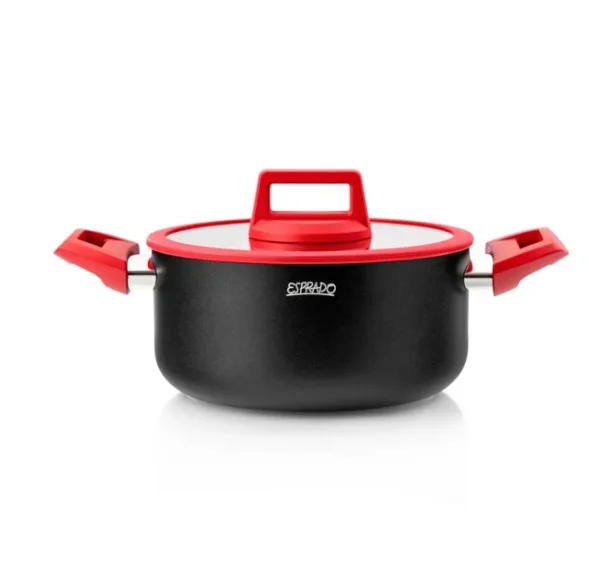 Кастрюля со стеклянной крышкой из штампованного алюминия: . Размер: 20*9.5 см. . Объем: 2.7 л. . Толщина дна – 3.0 мм. . Толщина стенок – 2.5 мм. . Внутреннее антипригарное покрытие Whitford Xylan Plus (2 слоя). цвет – черный. . Внешнее термостойкое силиконо-полиэстеровое матовое черное покрытие. Индукционное дно с фирменным логотипом. . Приваренные бакелитовые ручки с покрытием soft touch. цвет – красный. . Окрашенный обод. цвет – черный. . Плоская стеклянная крышка с оправой из силикона. с логотипом. бакелитовой ручкой soft touch . цвет – красный.