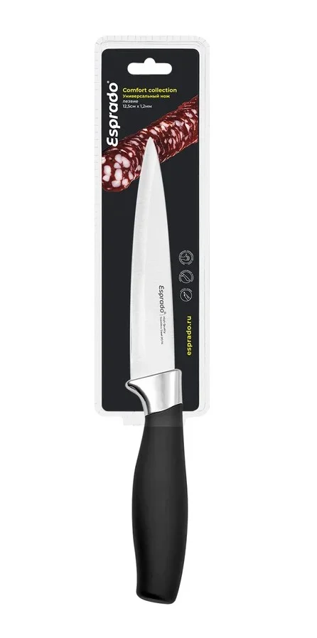 Универсальный нож 12.5 см Толщина лезвия 1.2мм. длина лезвия 12.5см. Материал- нерж.сталь 2Cr14. твердость лезвия по шкале Роквелла: 52-55 HRC. обработка лезвия: матовая полировка. ручка –черного цвета. Термопластичная резина + покрытие soft touch.