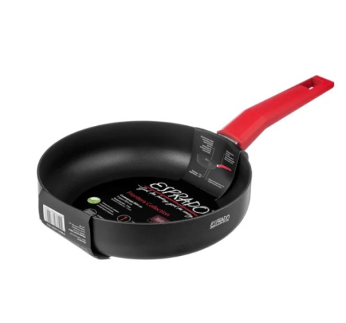 Глубокая сковорода из штампованного алюминия:. Размер: 24*6 см. . Толщина дна – 3.0 мм. . Толщина стенок – 2.5 мм. . Внутреннее антипригарное покрытие Whitford Xylan Plus (2 слоя). цвет – черный. . Внешнее термостойкое силиконо-полиэстеровое матовое черное покрытие. . Индукционное дно с фирменным логотипом. . Приваренная бакелитовая ручка с покрытием soft touch. цвет – красный. . Окрашенный обод. цвет – черный.