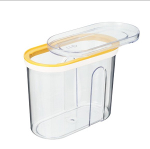Крышка-слайдер выполнена по би-компонентной технологии. Внешний край крышки из эластомера плотно примыкает к корпусу и не пропускает влагу и запахи. Крышка-слайдер проста в использовании, просто сдвиньте верхнюю прозрачную часть по направлению стрелки, а для закрытия, сдвиньте в обратном направлении. Через оптимальный размер отверстия удобно насыпать как мелкие, так и крупные сыпучие продукты. Специальные углубления на корпусе позволяют комфортно удерживать емкость в руках. Через прозрачный корпус и крышку хорошо видно содержимое и его количество. И не важно, где стоят ёмкости, на полке навесного шкафа или в выдвижном ящике. Конструкция крышки позволяет устойчиво ставить ёмкости один на другой для эффективного использования пространства.