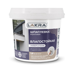 Шпатлевка акриловая универсальная 1,5кг Лакра используется для выравнивания дефектов поверхностей из минеральных материалов. Походит для внутренний и фасадных работ.