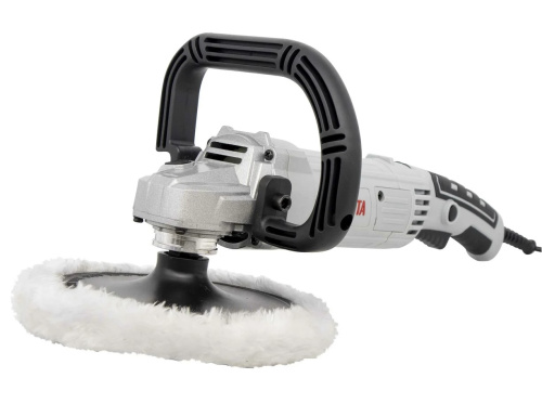 Устройство работает от сети, кнопка включения фиксируется, что избавляет от необходимости постоянно держать ее нажатой. Наличие плавного пуска устраняет возможность резких рывков при включении, а также защищает инструмент от поломки в результате скачка напряжения. Благодаря электронной регулировке частоты вращения (от 600 до 4500 об./мин), оператор имеет возможность выбирать скорость вращения круга для разных материалов. Простота замены полировальной тарелки обеспечивается за счет возможности блокировать вал нажатием кнопки на редукторе. За счет системы поддержания оборотов под нагрузкой полировальная машина стабильно работает независимо от степени давления на устройство. При повышении давления со стороны оператора мощность автоматически повышается, а число оборотов поддерживается на заданном уровне. Конструкция максимально продумана для удобства использования. Наличие D-образной ручки позволяет поддерживать устройство весом 2,8 кг второй рукой. Кабель имеет 2-метровую длину. В комплект входят полировальная тарелка, меховая насадка.