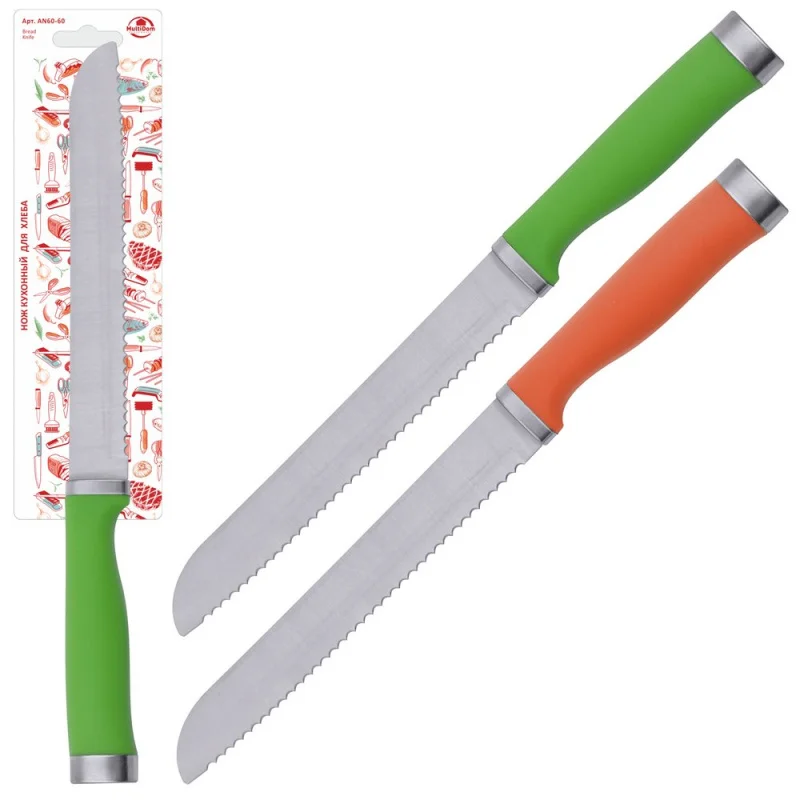 Используйте для хлеба ножи с волнообразной режущей кромкой, такая заточка долго сохраняет остроту, позволяет аккуратно отрезать даже очень мягкие продукты, не повреждая их структуру. Длинное лезвие позволяет работать с хлебобулочными изделиями любого размера. Лезвие изготовлено из коррозионностойкой (нержавеющей) стали, ручка из пластмассы. Можно мыть в посудомоечной машине.