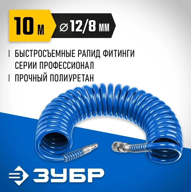 Воздушный шланг с фитингами ЗУБР 6472-10 предназначен для соединения компрессора с различными насадками. Максимальное давление 15 бар.