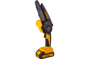 Емкость батареи составляет 2 А*ч, поэтому можно работать без дополнительной зарядки продолжительное время. В комплект входит 2 аккумулятора, что позволяет пилить практически непрерывно. Электропила данной модели отличается высокой производительностью и способна пилить со скоростью 6,5 м/с. Комплектуется инструмент шиной длиной 150 мм (6 дюймов), поэтому не может использоваться для распиливания крупной древесины.