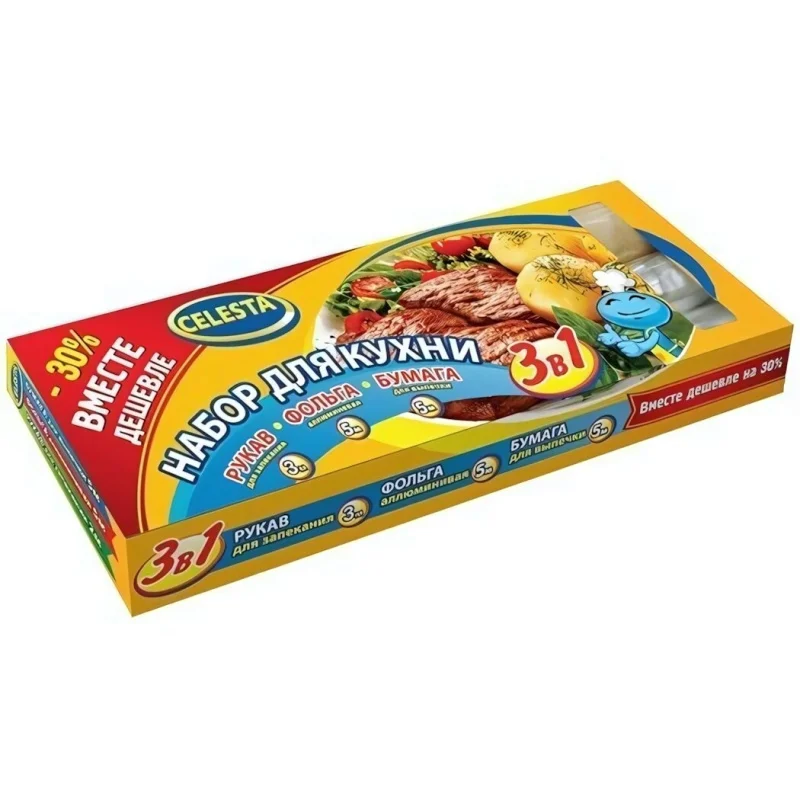 Состав набора: * Рукав для запекания 3м предназначен для приготовления низкокалорийных блюд в собственном соку, без использования масла и жира. Позволяет уменьшить время приготовления продуктов. Изготовлен из специального термостойкого материала. Не пригорает, предотвращает загрязнение духовки. Избавляет от утомительного мытья посуды. *Бумага для выпечки 5м идеально подходит для выпекания кондитерских и хлебобулочных изделий в духовом шкафу и микроволновых печах, упаковки и хранения продуктов. Предохраняет от прилипания и пригорания выпекаемых изделий. Не пропускает влагу. Перед применение необходимо смазать маслом. *Фольга алюминиевая 5м предназначена для запекания мяса, рыбы, птицы, овощей в духовом шкафу и на гриле. Используется для хранения и упаковки пищи, превосходно сохраняет продукты в свежем виде.