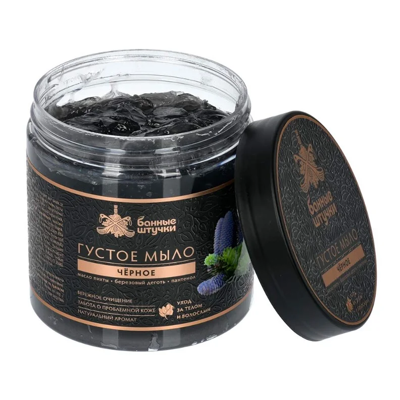 Густое мыло прекрасно сочетает в себе свойства шампуня и геля для душа. Оно подходит для ухода за телом и волосами. Входящие в состав эфирное масло пихты и березовый деготь обладают противовоспалительными и восстанавливающими свойствами, способствуют нормализации работы сальных желез, а пантенол помогает увлажнить и смягчить кожу. Черное мыло также содержит экстракты растений, благоприятно воздействующие на кожу и волосы. Для использования в бане, сауне и дома.
