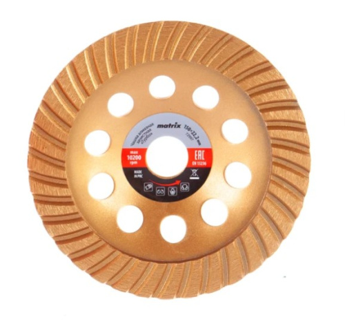 Алмазная зачистная чашка Matrix Turbo 72997 диаметром 150 мм устанавливается на вал углошлифовальной машины, для чего предусмотрено посадочное отверстие 22,2 мм. Используется для придания окончательной гладкости бетонным, каменным, мраморным, гранитным и кирпичным поверхностям, а также для снятия фаски на плитах из гранита или мрамора. Чашка демонстрирует высокие результаты благодаря увеличенной концентрации алмазов в рабочем слое и сбалансированной связке. Предназначена для профессионального применения.