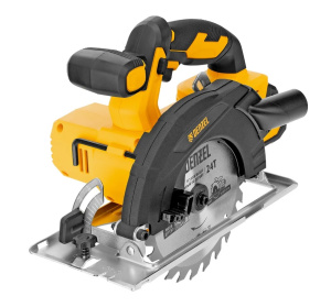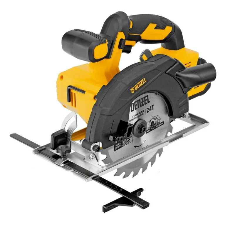 Циркулярная аккумуляторная пила Denzel CCSH-20-165 27405 работает от источника питания Li-Ion 20 В и совместима с пильными дисками диаметром 165 мм.